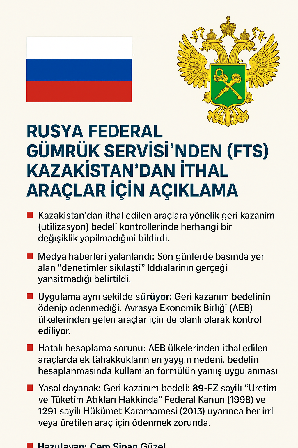 Rusya Federal Gümrük Servisi (FTS), Kazakistan’dan ithal edilen araçlara yönelik geri kazanım bedelinin (utillizasyon) ödenme kontrollerinde herhangi bir değişiklik yapılmadığını bildirdi. Kurum, son dönemde medyada bu konuda çıkan haberlerin gerçeği.. daha fazla  Haberi Okudum!