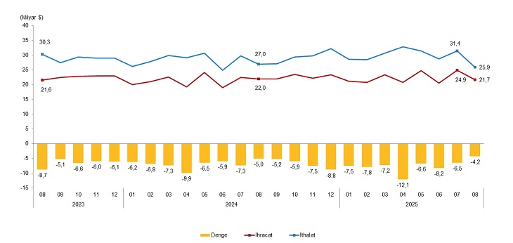 Ağustos ayında dış ticaret açığı bir önceki yılın aynı ayına göre %15,8 azalarak 5 milyar 4 milyon dolardan, 4 milyar 211 milyon dolara geriledi. İhracatın ithalatı karşılama oranı 2024 Ağustos ayında %81,5 iken, 2025 Ağustos ayında %83,8'e yükseldi.