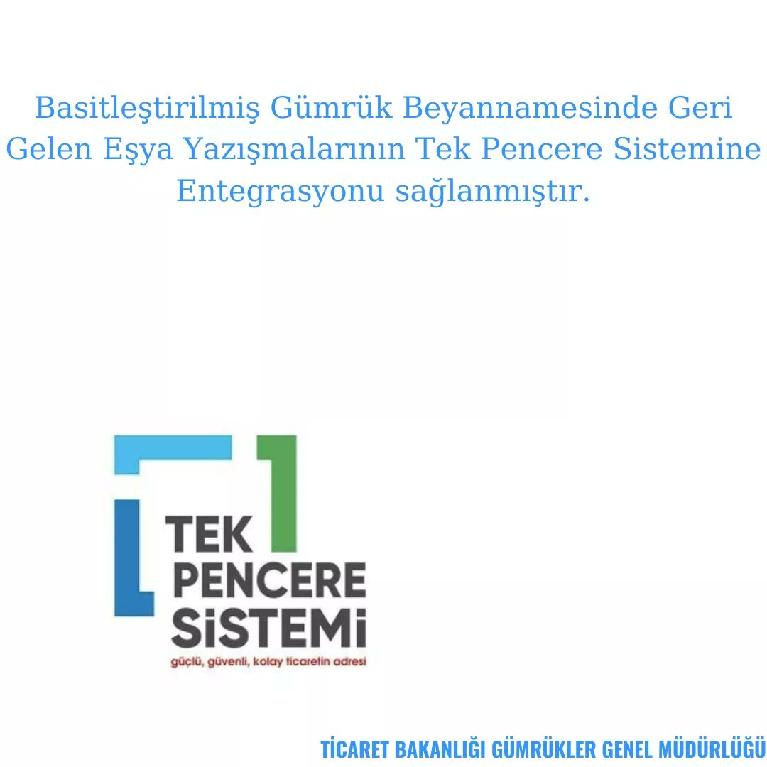 Basitleştirilmiş Gümrük Beyannamesinde (BGB) Geri Gelen Eşya Yazışmalarının Tek Pencere Sistemine (TPS) Entegrasyonu sağlanmıştır.
